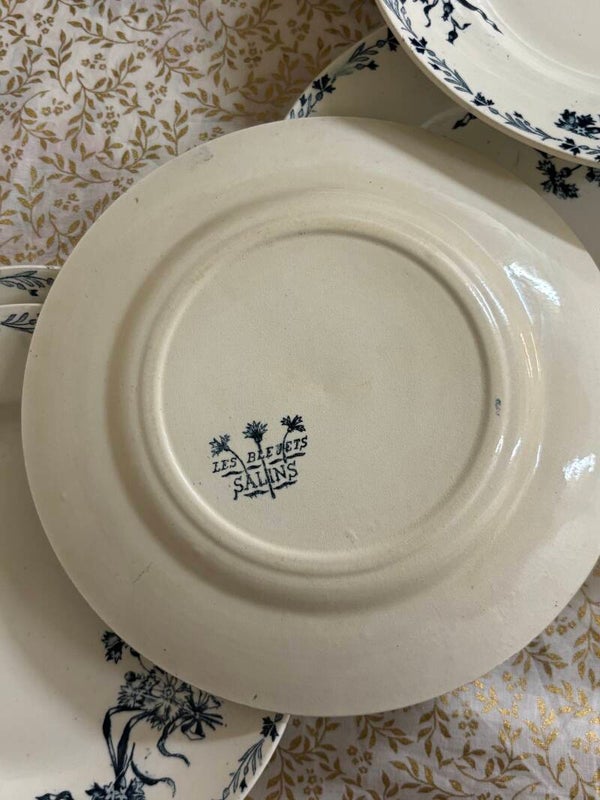 Lot de 6 assiettes à dessert en terre de fer, modèle "les bleuets" de salins, en très bel état, pas de fêle ni d'éclat.