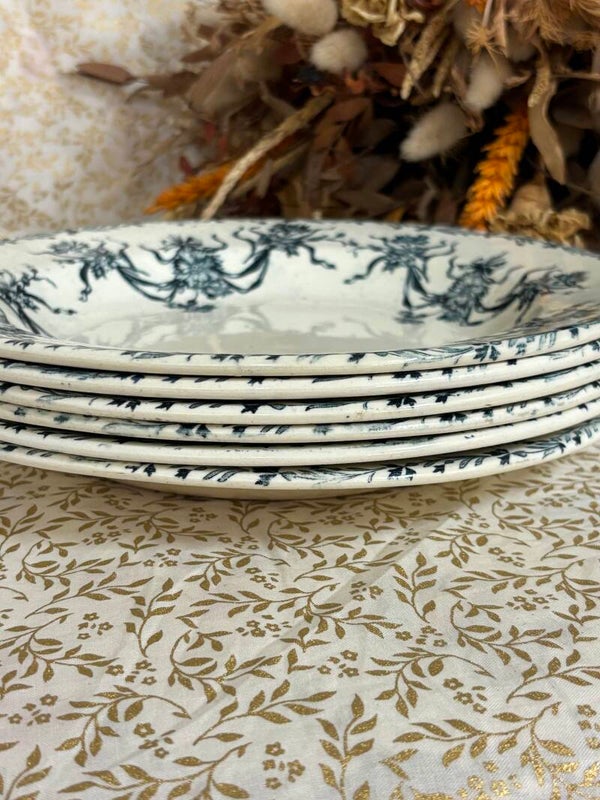 Magnifiques assiettes à soupe en terre de fer, modèle "les bleuets" de Salins, en très bel état pour leur âge (années 1910). Pas de fêle ni d'éclat