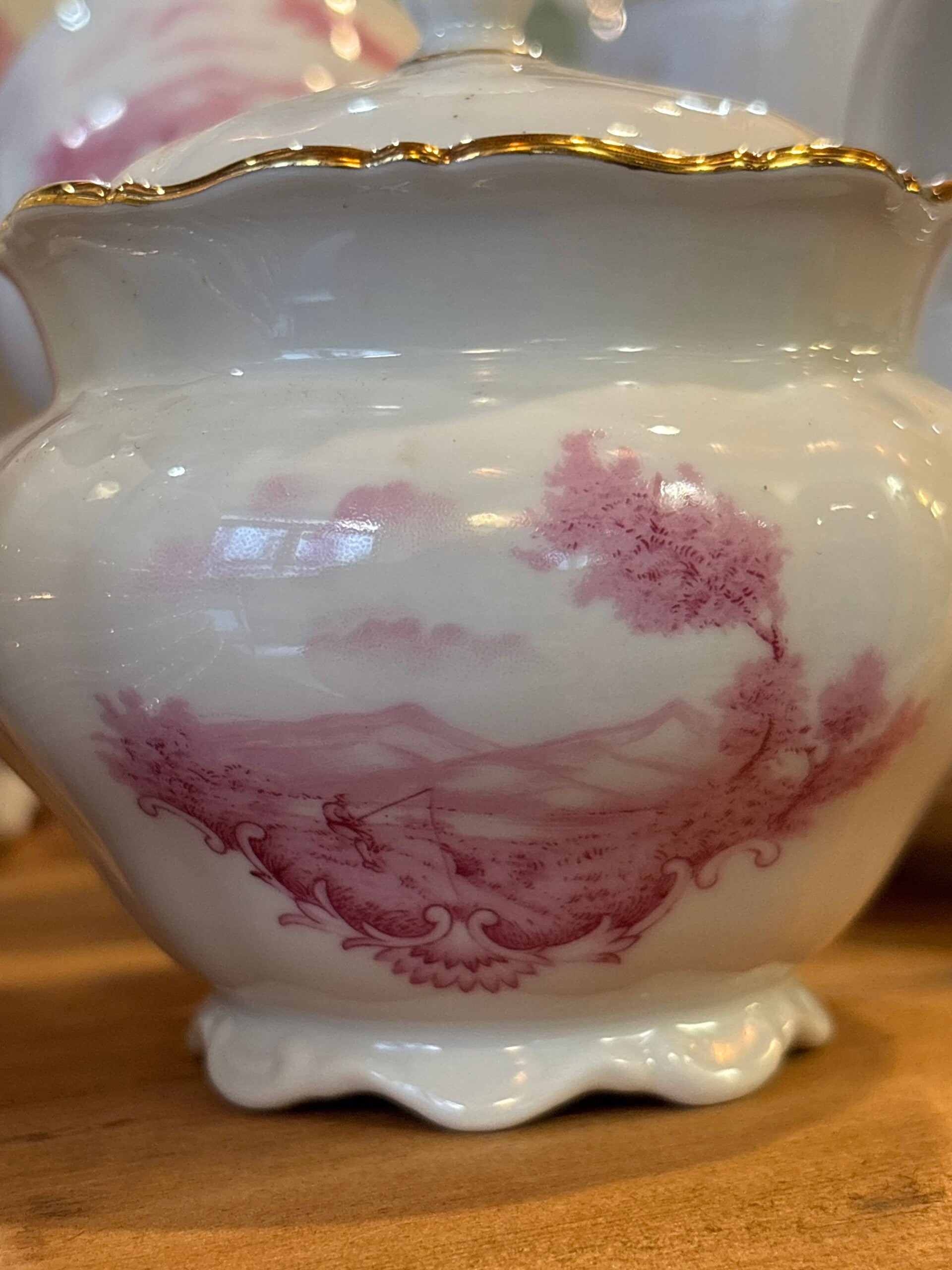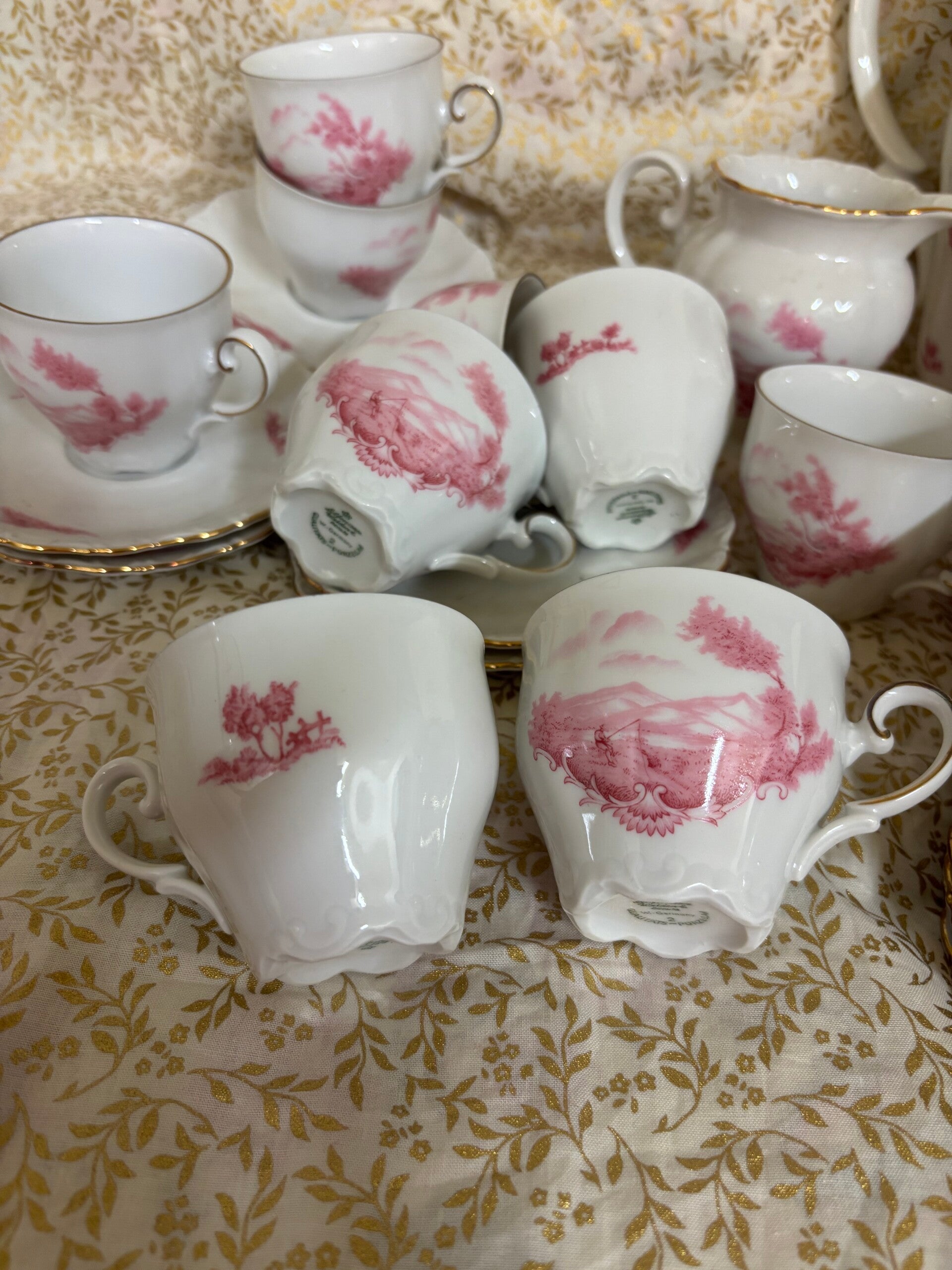 Service à café en porcelaine fine de Bavière, très beaux motifs roses et finitions dorées, en parfait état.