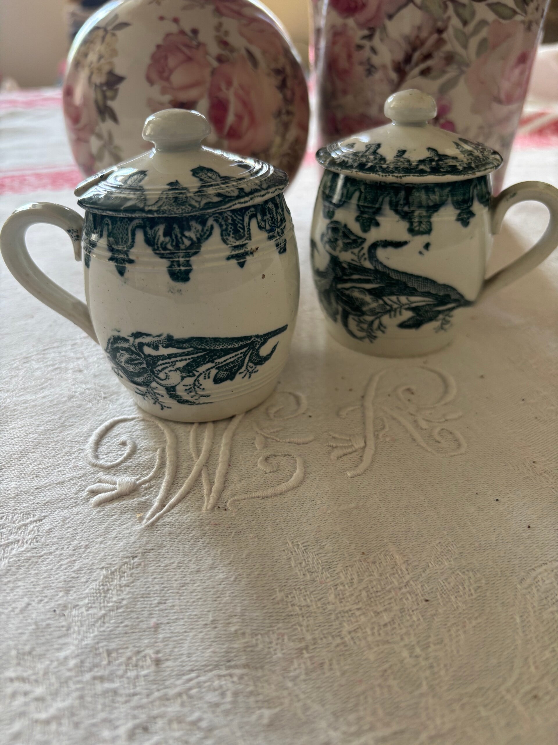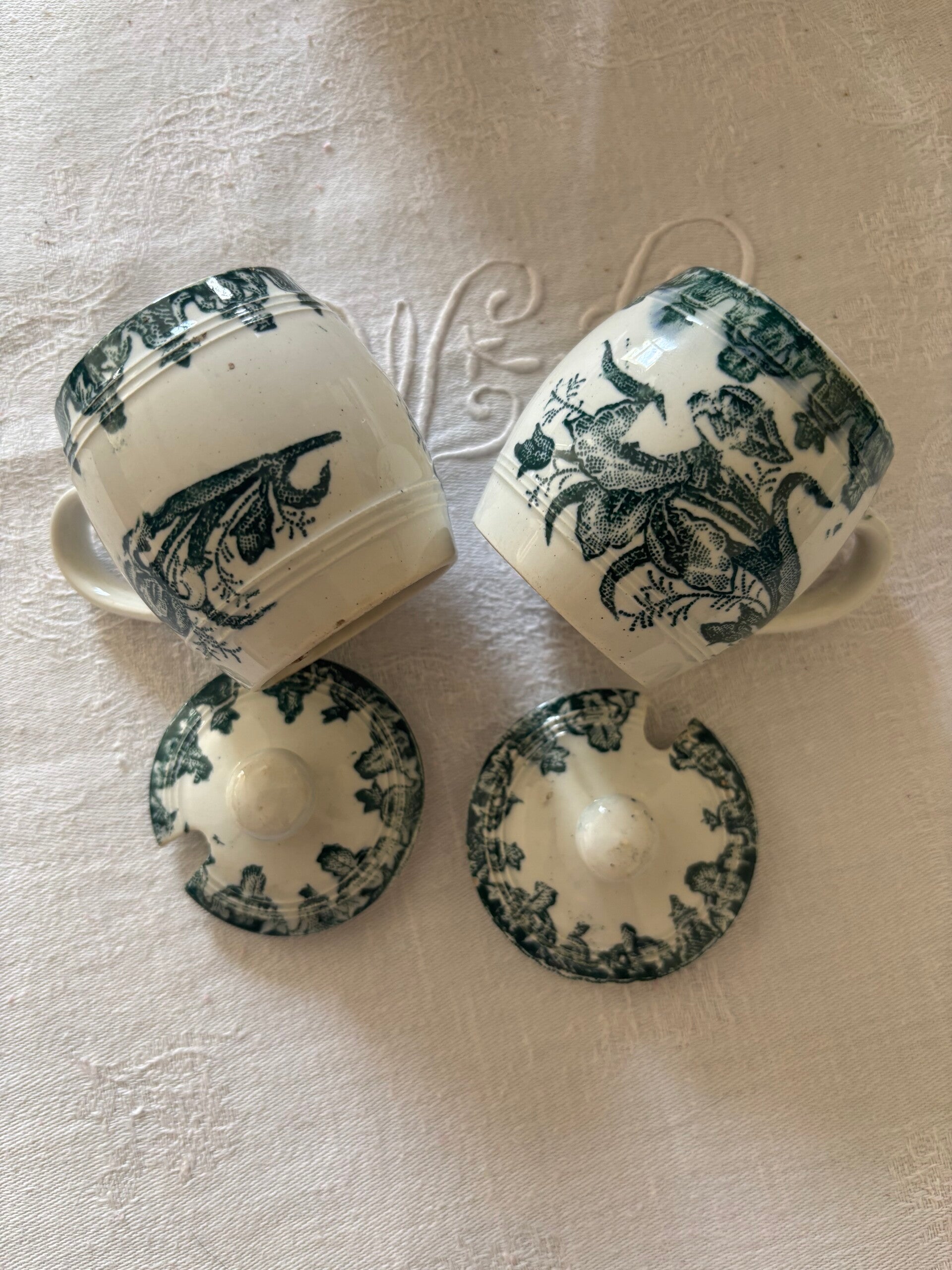 Très beau moutardier en terre de fer motif floral, d'un beau vert bouteille.