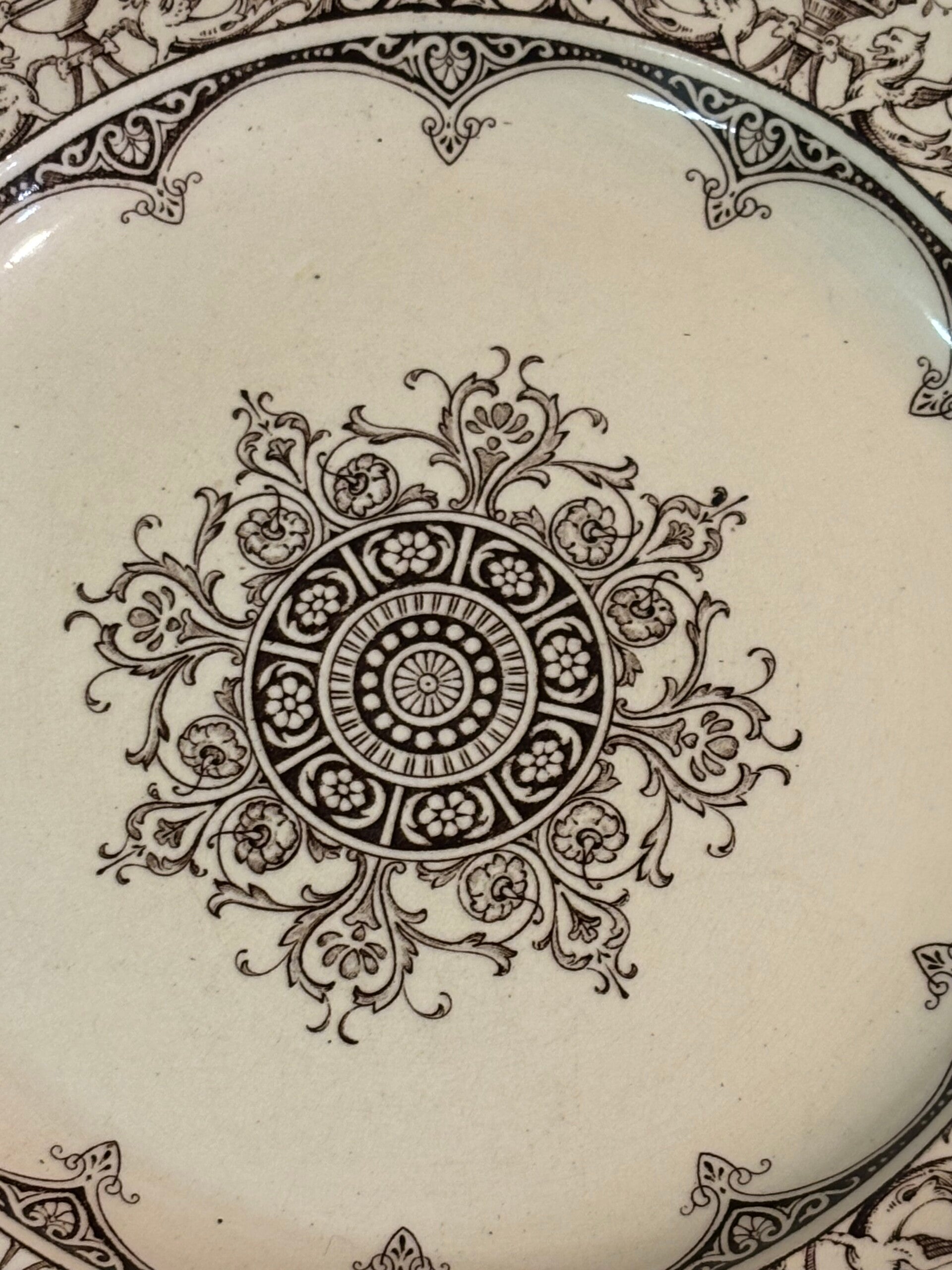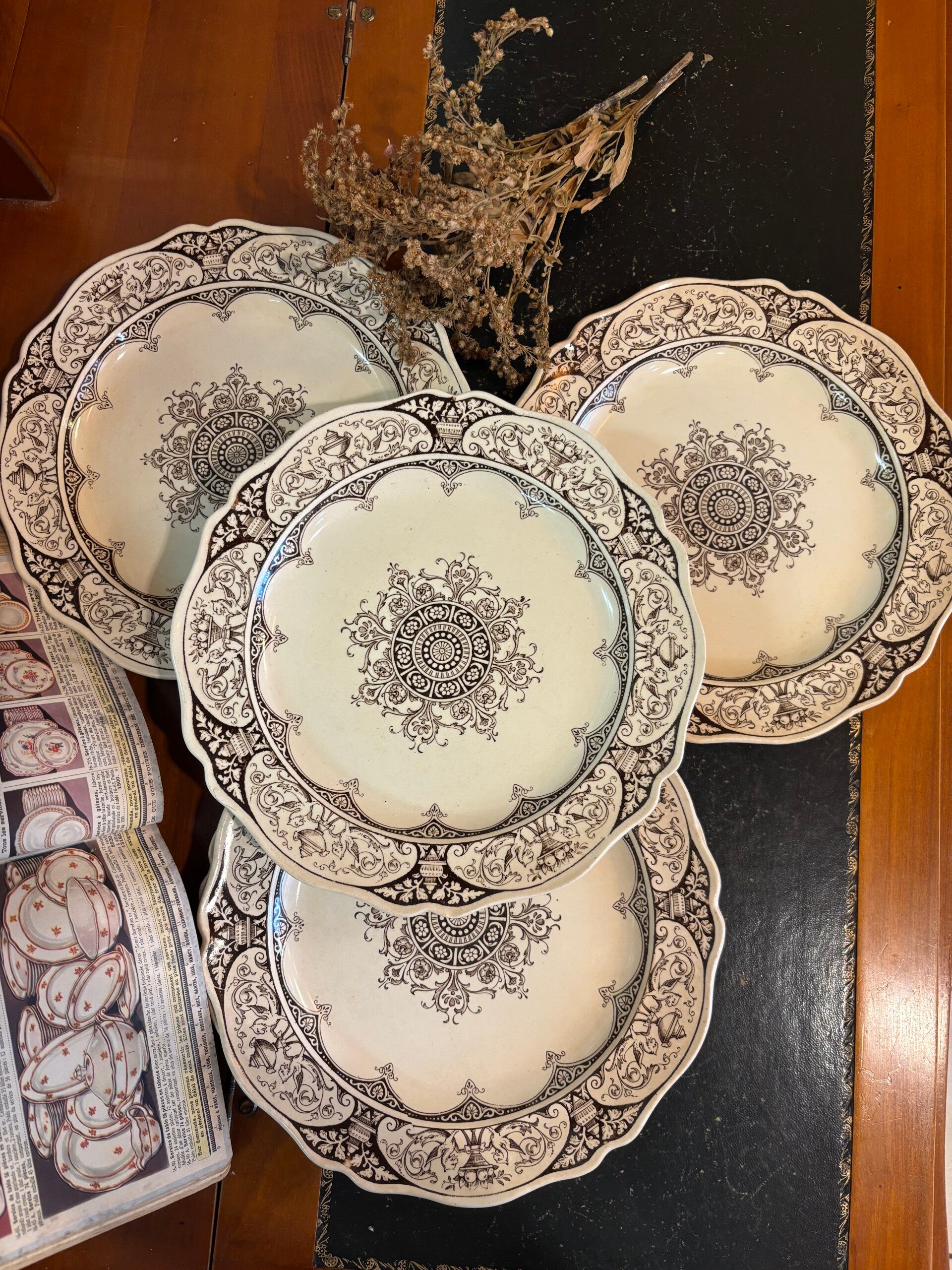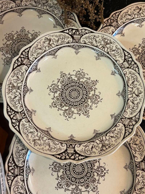 très belles assiettes en terre de fer, de la manufacture anglaise Wedgwood, modèle Queen Charlotte « Rd 1474 », pas de fêle ni d’éclat, jolie patine due à leur âge et à leur utilisation, motifs coloris sépia sur pâte crème.