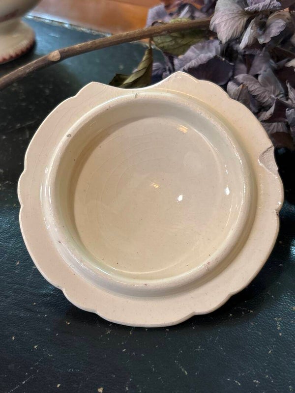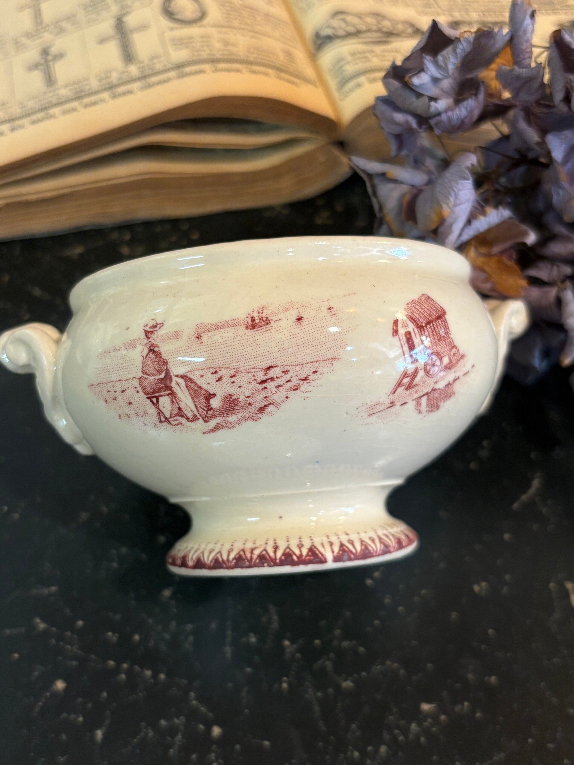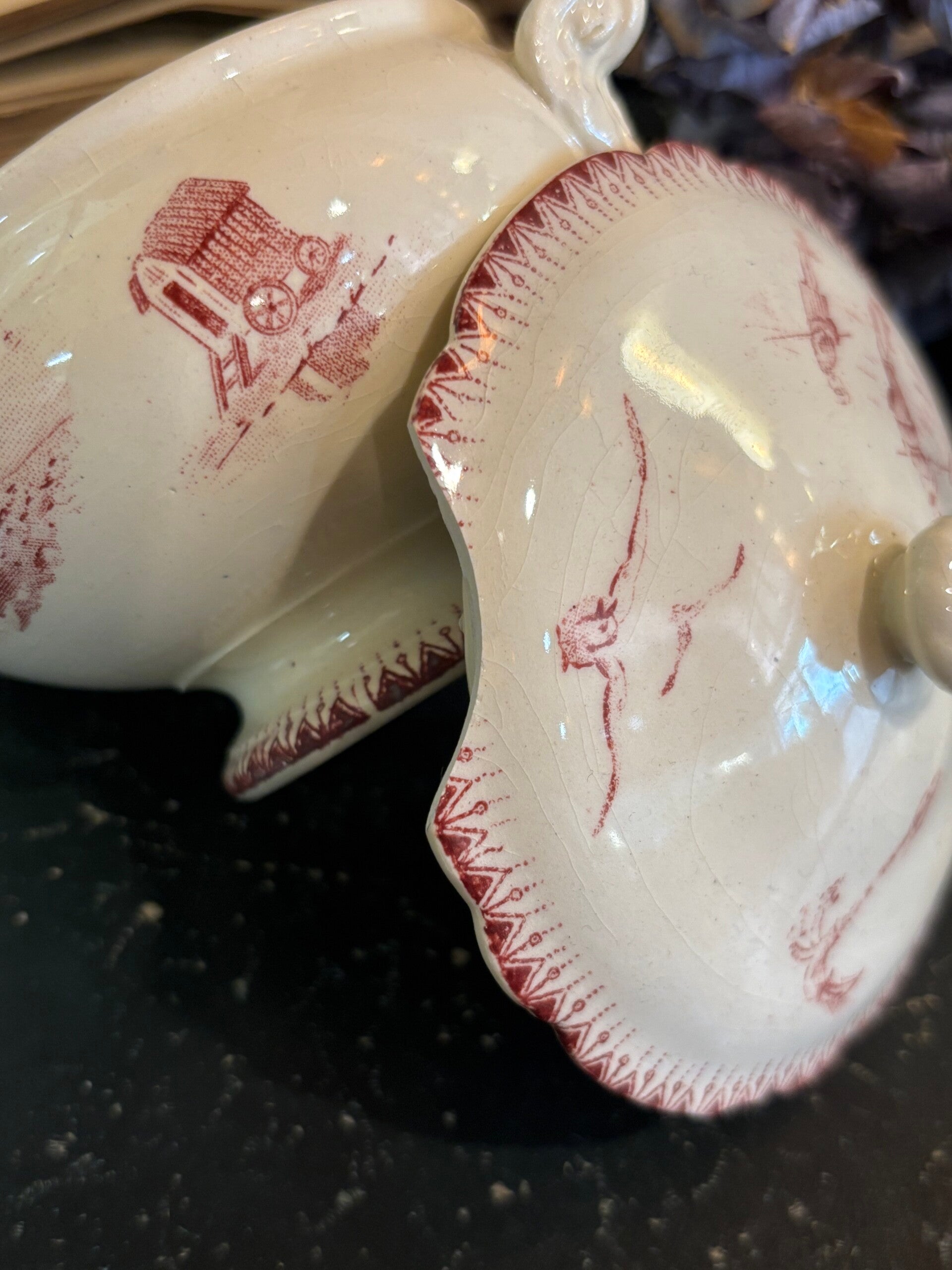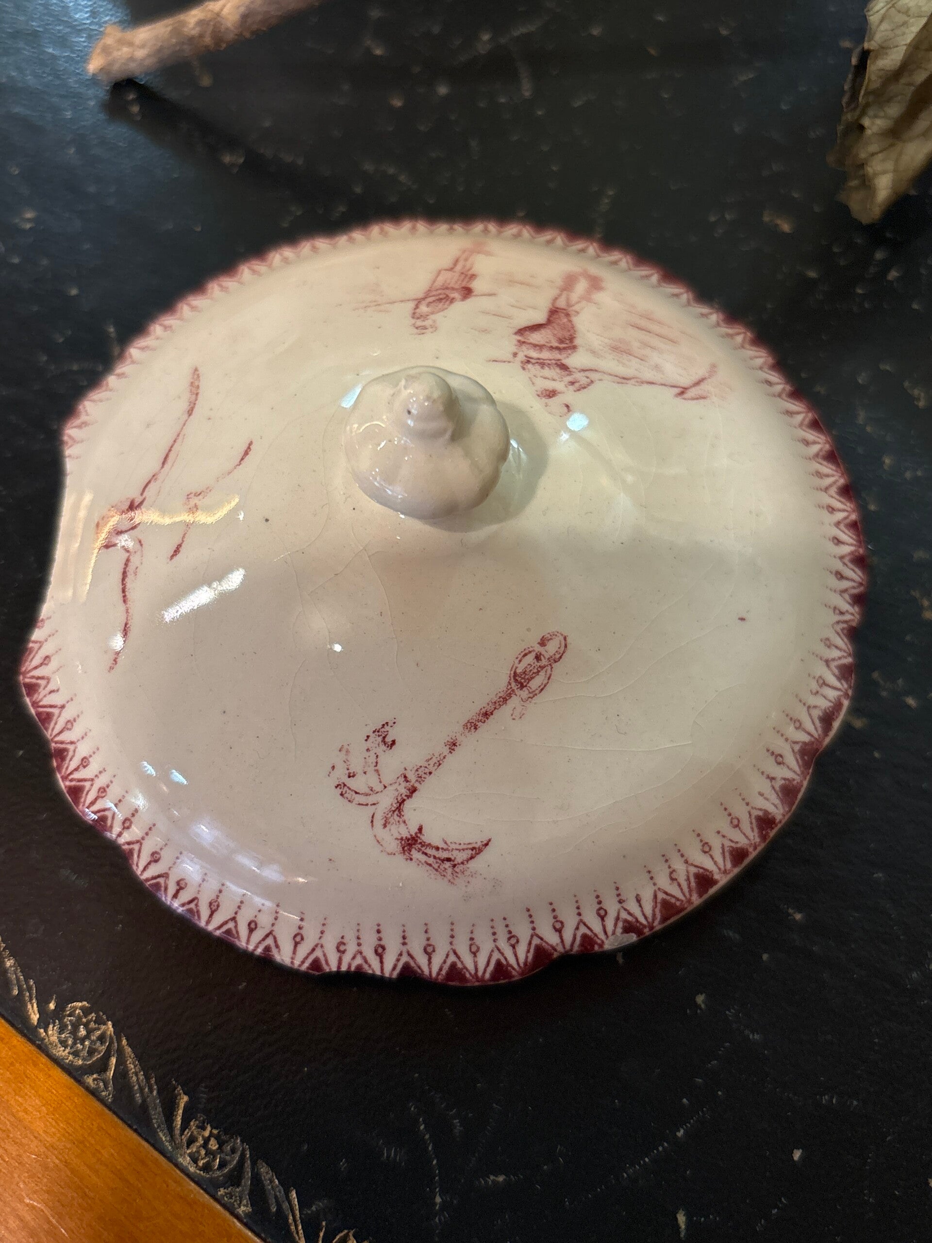 Rare et très jolie soupière de dînette pour enfant, hauteur 9cm, en terre de fer rose, en excellent état, hormis un éclat sur le couvercle qui a été poli pour laisser imaginer l'emplacement d'une louche, et un éclat sur le dessous invisible dessus