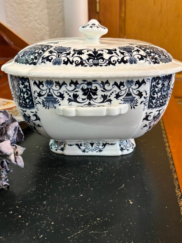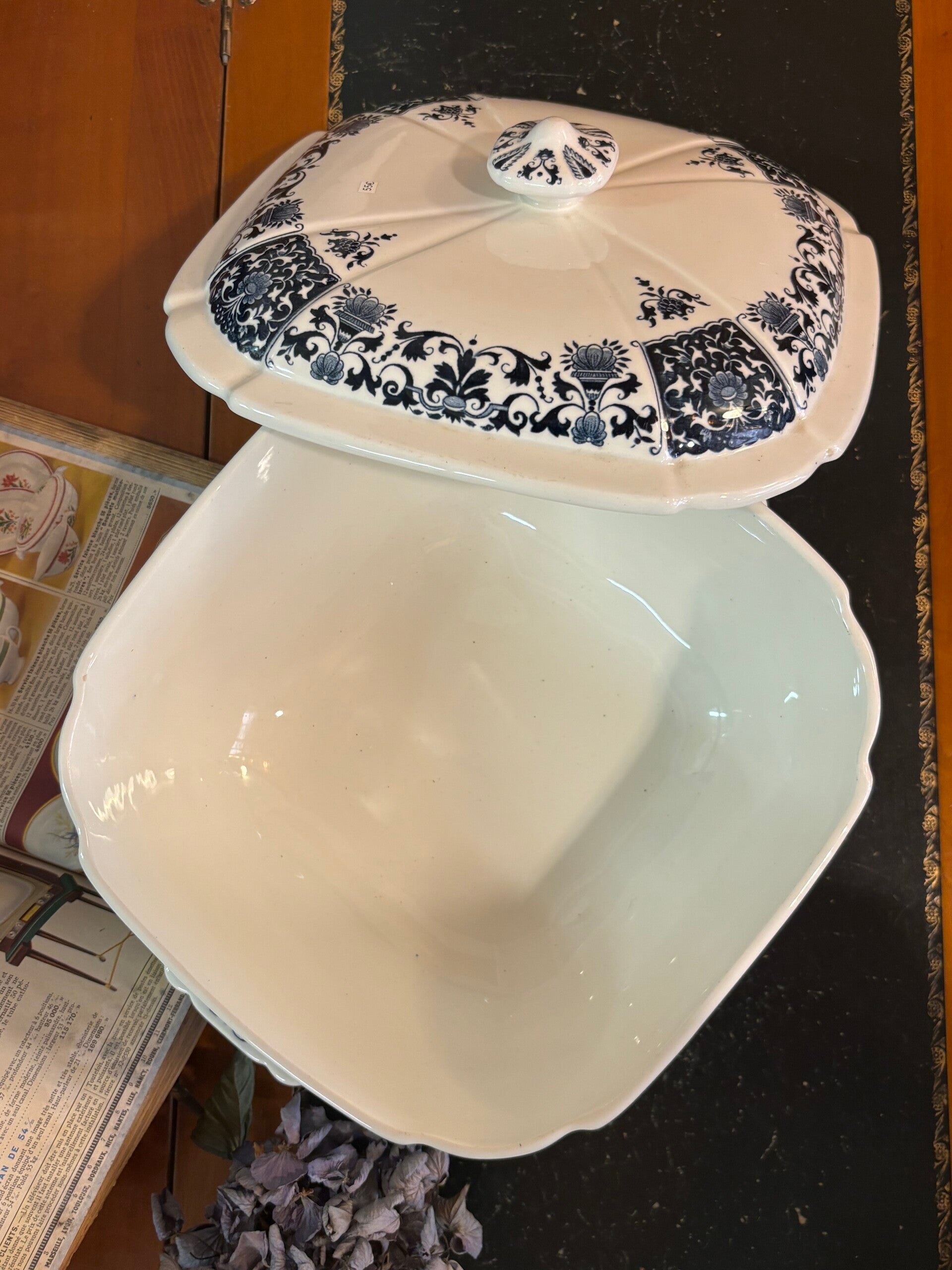 Magnifique soupière carrée en terre de fer, modèle « Carré bleu » de Gien, d’autres pièces du service disponible.en parfait état ni fêle ni éclat.