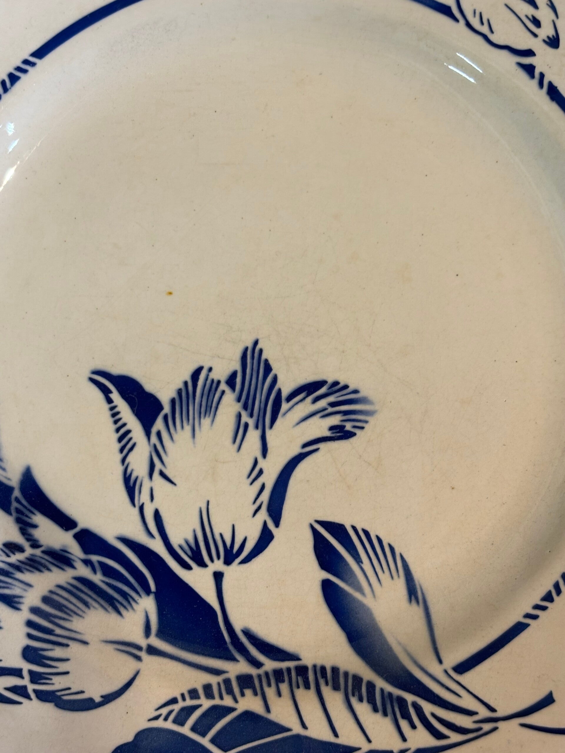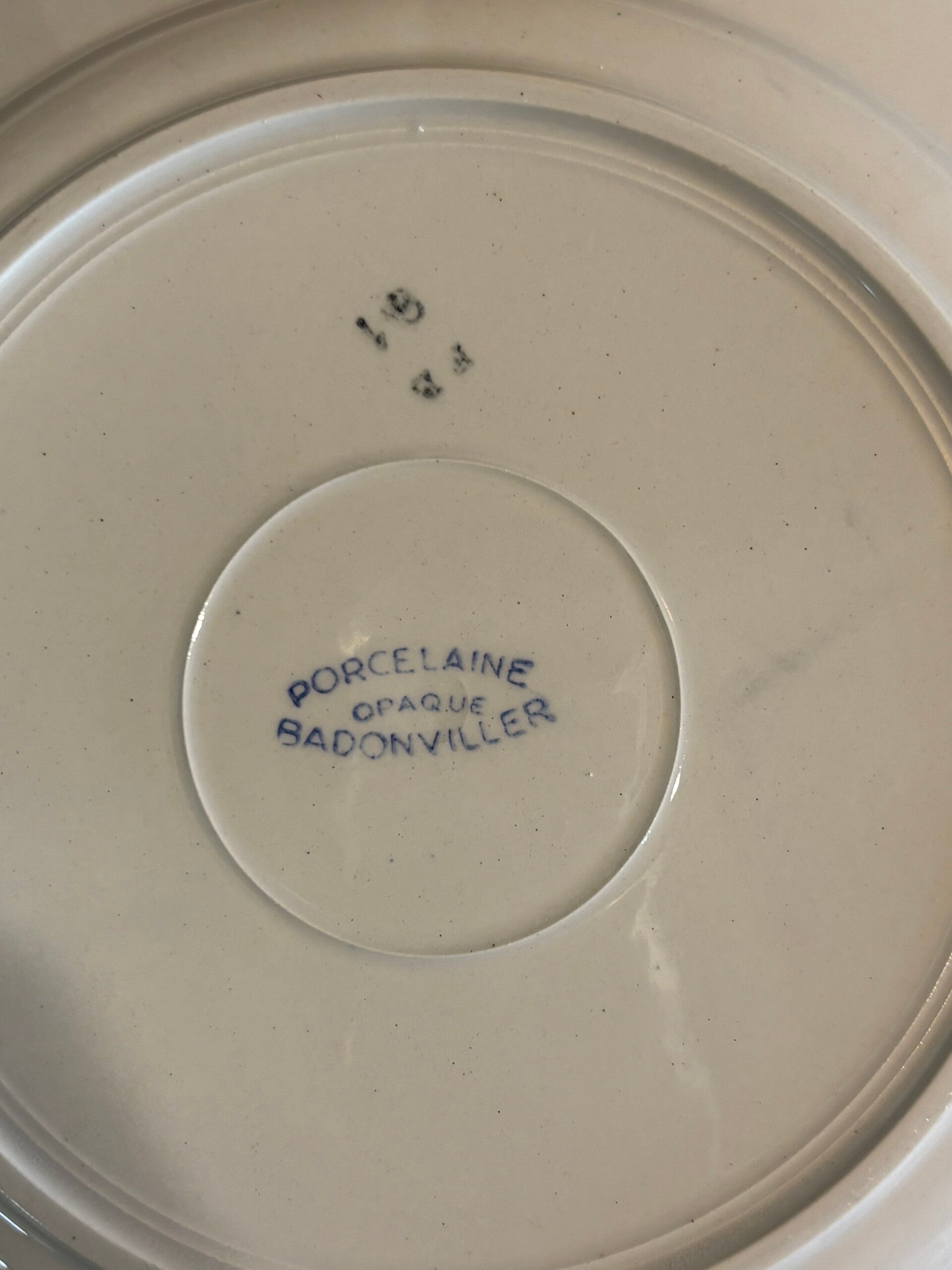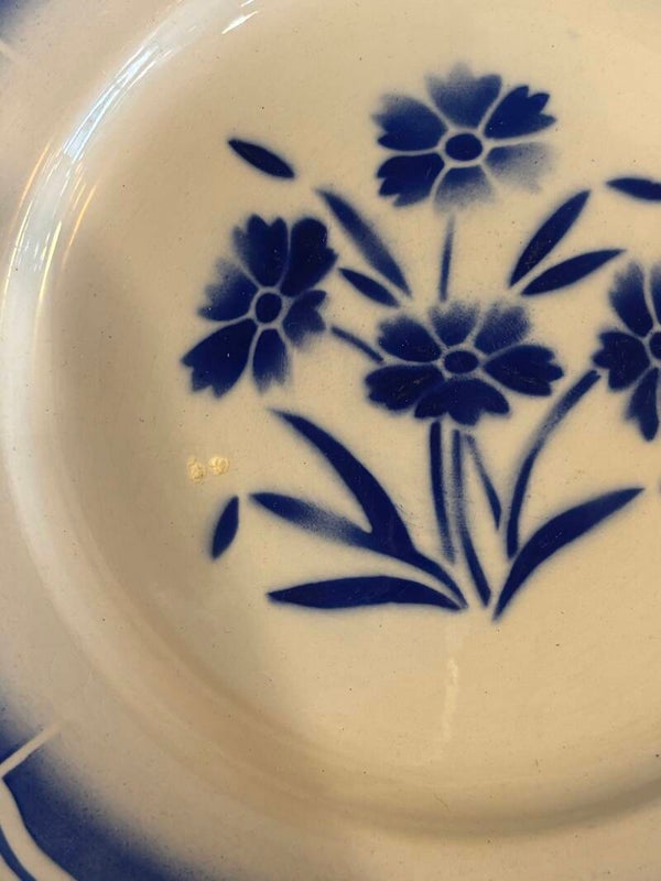 *2 Badonviller, fleurs bleues au centre, 1 petit défaut de cuisson visible sur les photos, parfait état ni fêle, ni rayures, ni éclat, diamètre 22,5cm