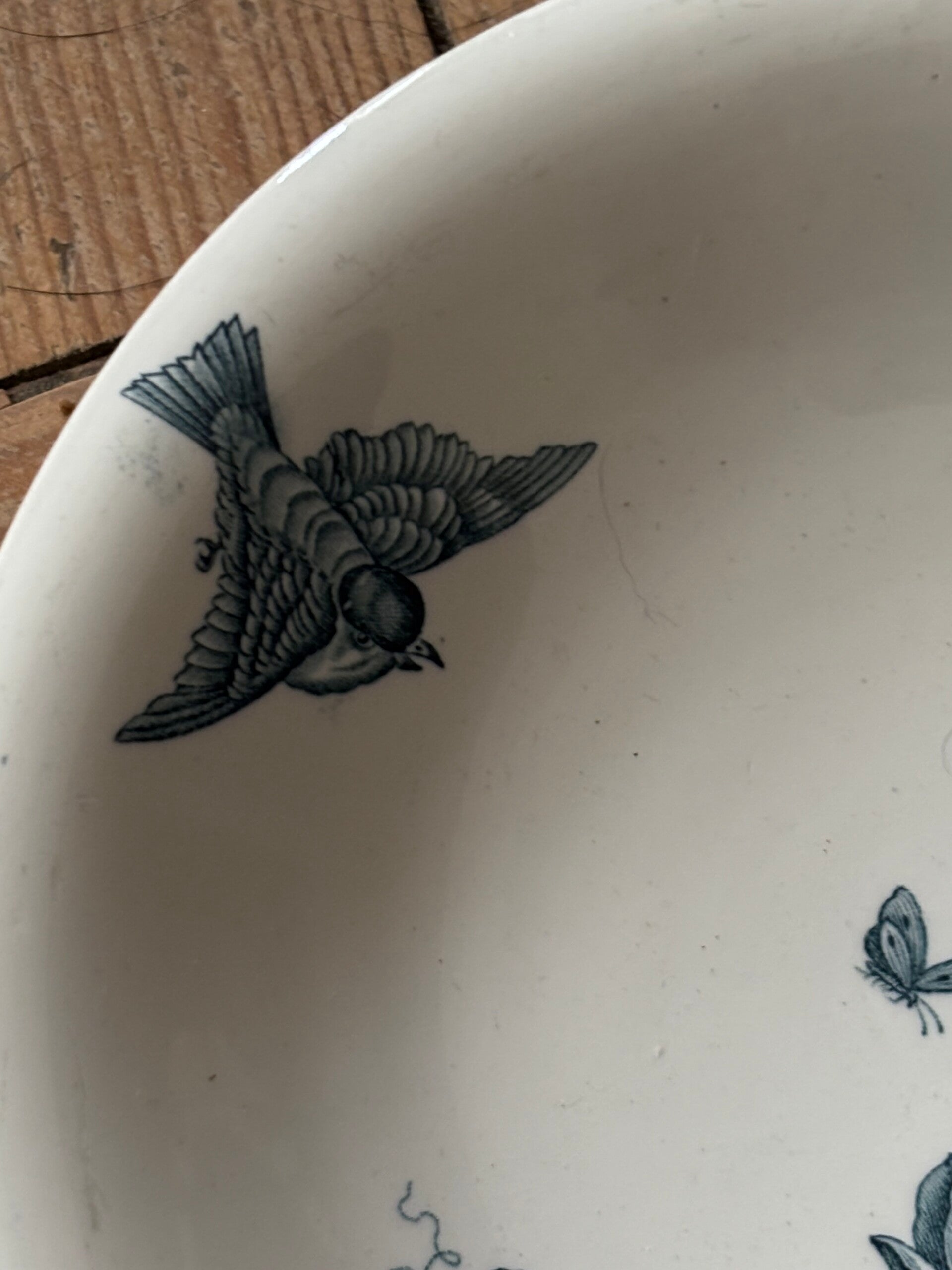Superbe assiette sur piédouche, en terre de fer motifs bleus/verts sur pâte crème, diamètre 22,5cm, de la manufacture impériale et royale Nimy (Belgique).