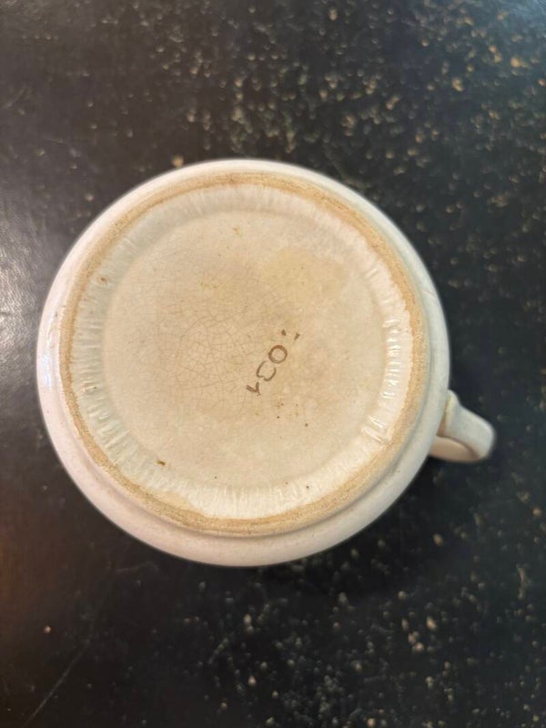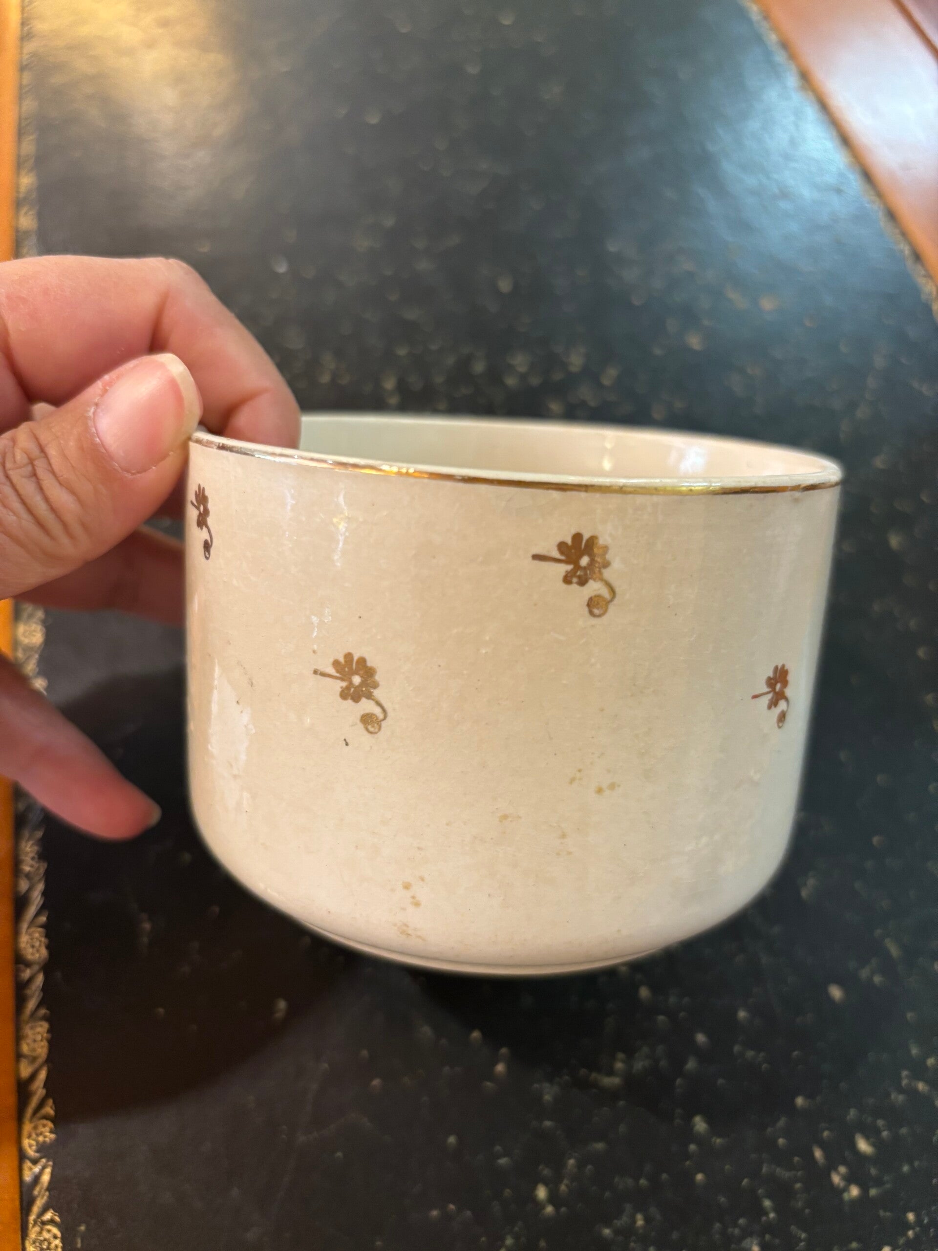 Superbe grosse tasse à chocolat en terre de fer, pâte crème, motifs petites fleurs dorées en parfait état sans éclat ni fêle, quelques légères taches au fond, dues à son utilisation.